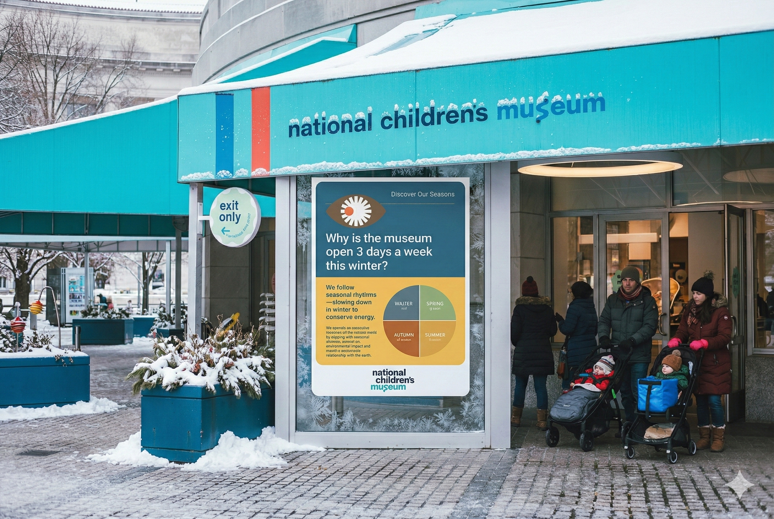 Outside the National Children's Museum on a January morning, a large sign stands next to the entrance doors. Families with strollers gather near the exit-only sign, their coats tightly wrapped, breath visible. A large question looms: Why is the museum open 3 days a week this winter? It captures the irritation of a visitor—half complaint, half demand—and the museum has displayed it prominently.